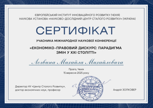15 вересня 2025 року зав. кафедри туристичного та готельного бізнесу доц. Логвин М.М. та здобувачка вищої освіти другого (магістерського) рівня Єгорова О.В. взяли участь у Міжнародній науковій конференції «Економіко-правовий дискурс: парадигма змін у ХХІ столітті», яка відбулася у м. Прага (Чехія). Учасники отримали іменні сертифікати.