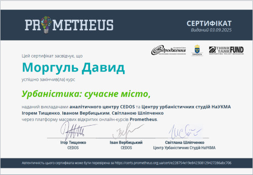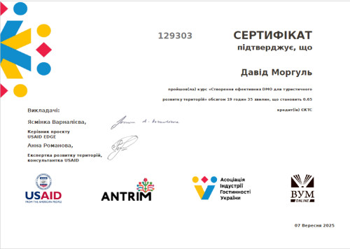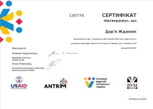 Індивідуальна освітня траєкторія – це можливість для студентів бути повноправним творцем свого навчального процесу. ПУЕТ надає широкі можливості не лише для формальної, а й неформальної освіти, яка дозволяє розширити і поглибити професійні знання, а також сформувати додаткові вміння й навички та забезпечити особистісний розвиток. Одним із засобів неформальної освіти, що пропонується ЗВО за освітньою програмою «Туризм» є вивчення певного навчального контенту на відкритих освітніх платформах «ВУМ online», Prometheus, НТОУ тощо. Студенти 4 курсу – Жданюк Дар’я, Моргуль Давид та Лугина Валентина успішно завершили навчання на вищезазначених платформах, розширивши свої знання щодо розбудови туристичних дестинацій з урахуванням принципів сталого розвитку, функціонування туристичних об’єктів у воєнний час та розвитку туризму в містах.